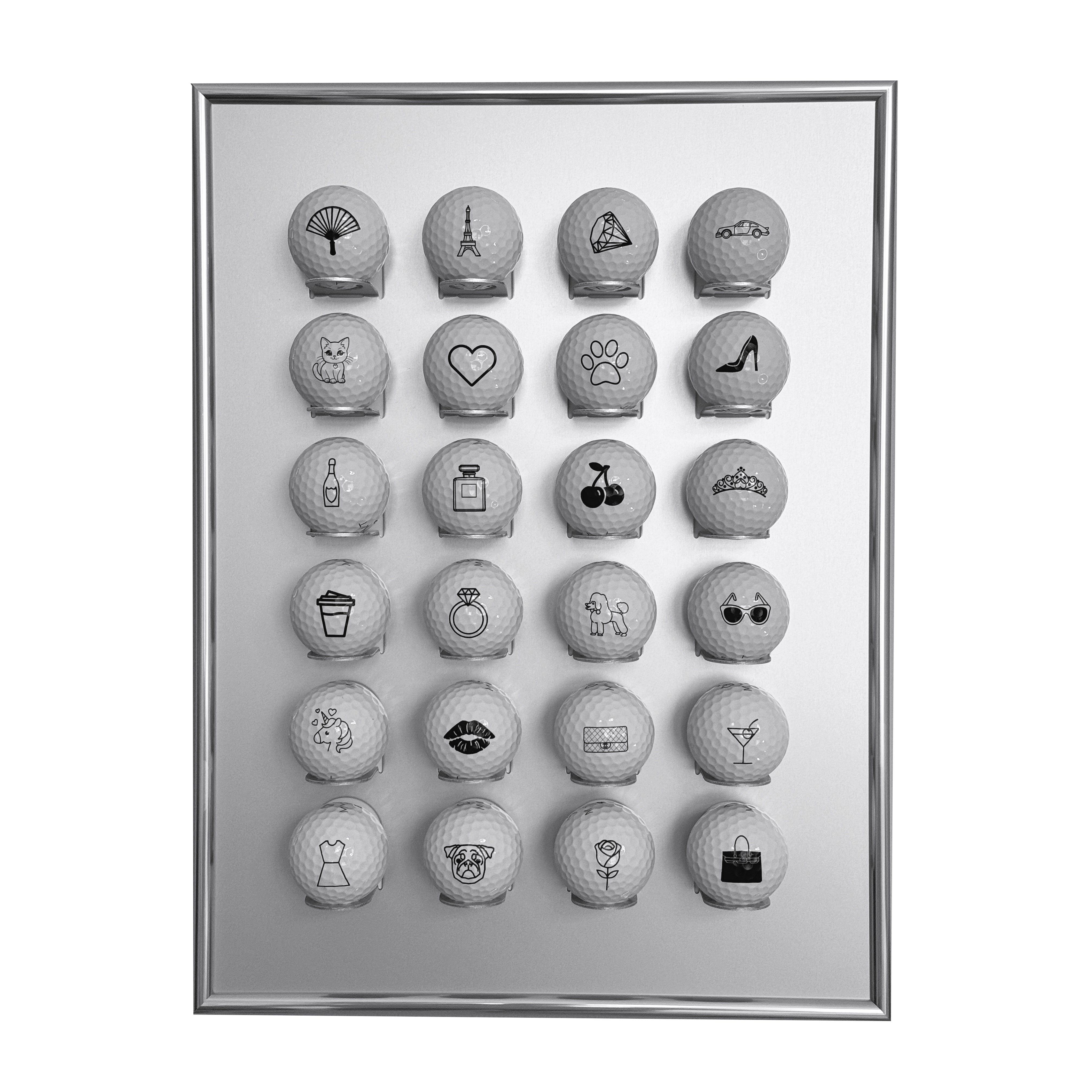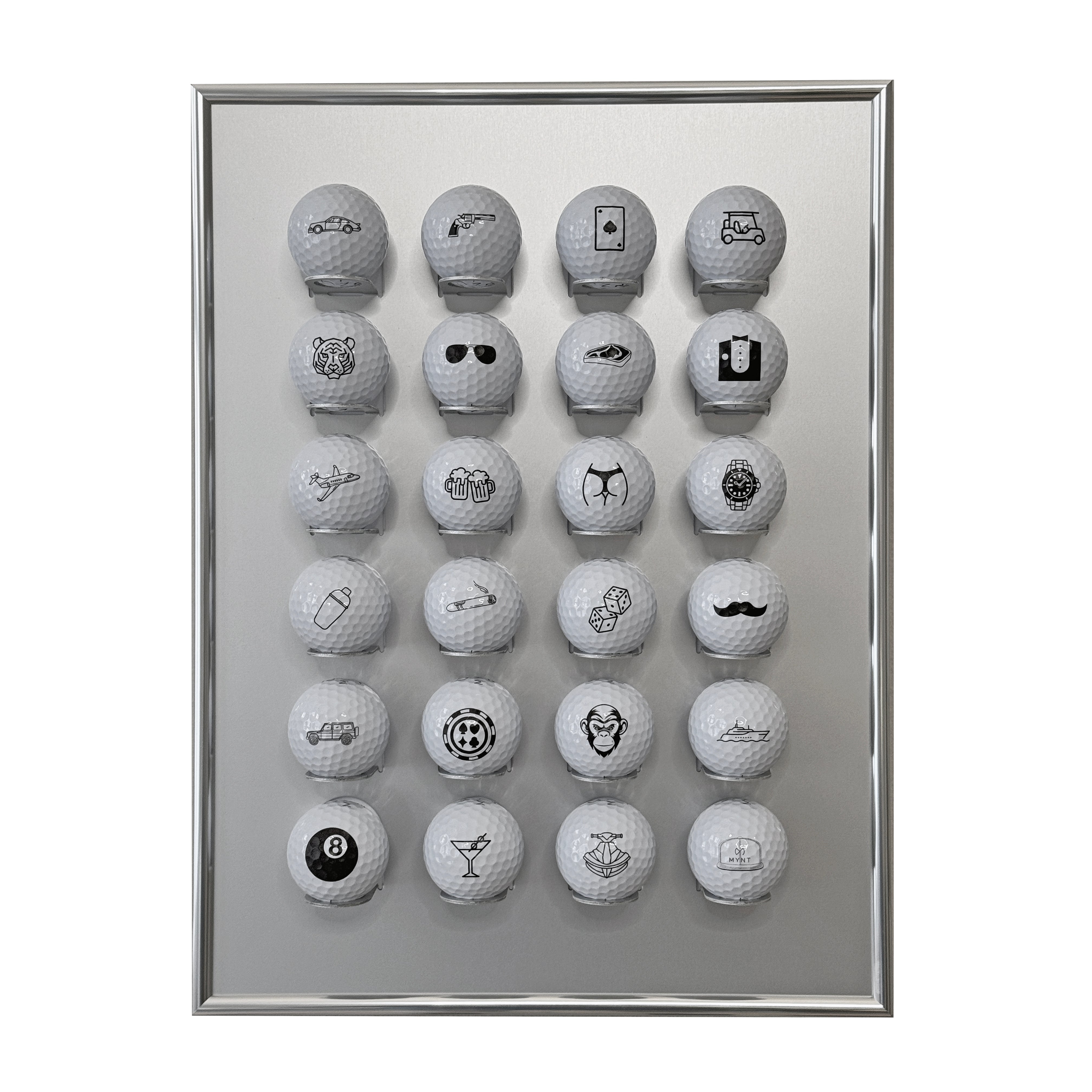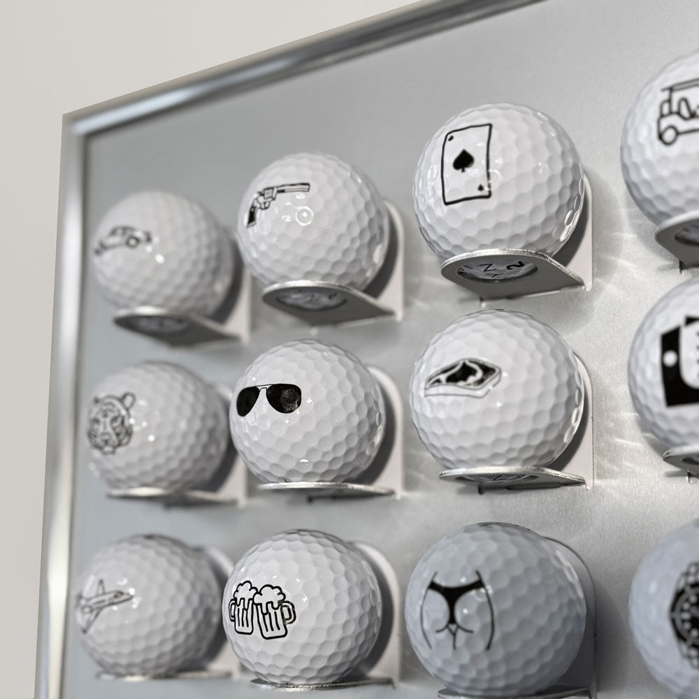 Der Golfball Setzkasten von KNIX bietet Platz für 24 Golfbälle, ist aus eloxiertem Aluminium gefertigt und wird von einem hochwertigen Bilderrahmen, ebenfalls aus Aluminium, eingerahmt.